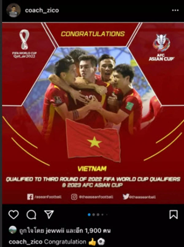 “Zico Thái” đã đăng tải bức ảnh các cầu thủ Việt Nam ôm nhau cùng lá cờ đỏ sao vàng và lời nhắn trên trang Instagram cá nhân của ông, “Xin chúc mừng”. Trang Instagram của Kiatisak với tên @coach_zico hiện có 1,1 triệu lượt theo dõi.