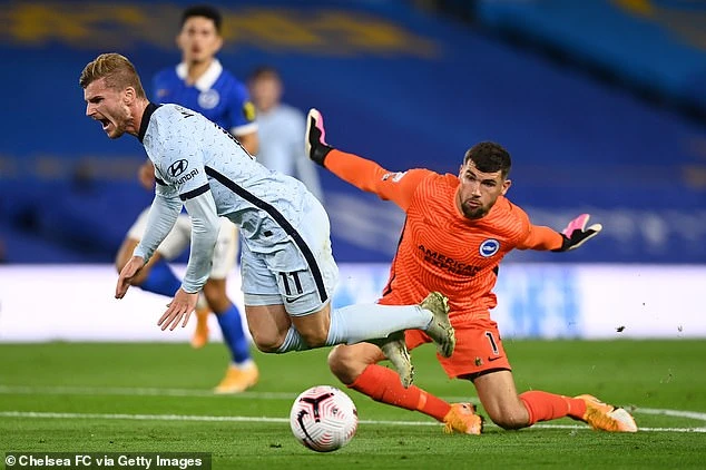Tốc độ của Timor Werner buộc thủ môn Ryan phạm lỗi trong vòng cấm. ẢNH: GETTY IMAGES