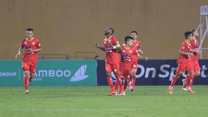 Hoàng Vũ Samson (giữa) ghi bàn danh dự cho Thanh Hóa. Ảnh: Báo BĐ