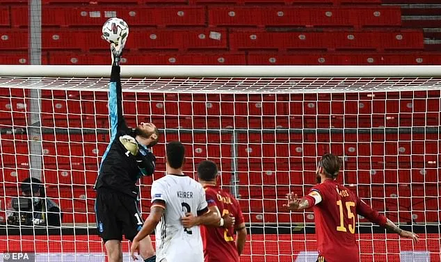 Ở hiệp 2, De Gea một lần nữa hoàn thành xuất sắc nhiệm vụ khi tung người đẩy bóng qua xà từ cú đánh đầu của hậu vệ Sule bên phía tuyển Đức.