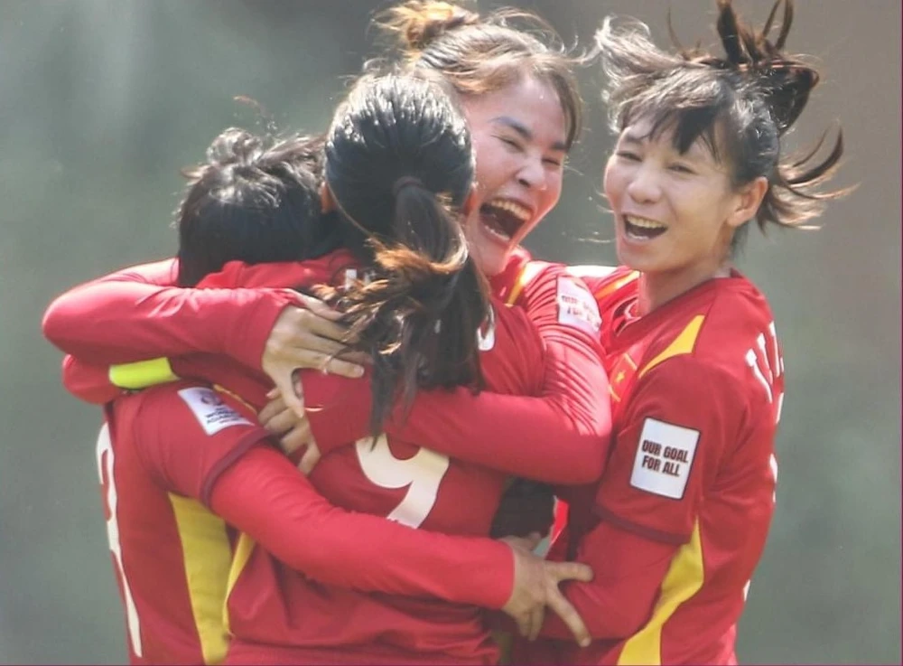 Niềm hạnh phúc của tuyển nữ Việt Nam khi giành vé chơi vòng chung kết World Cup 2023. Ảnh: AN.