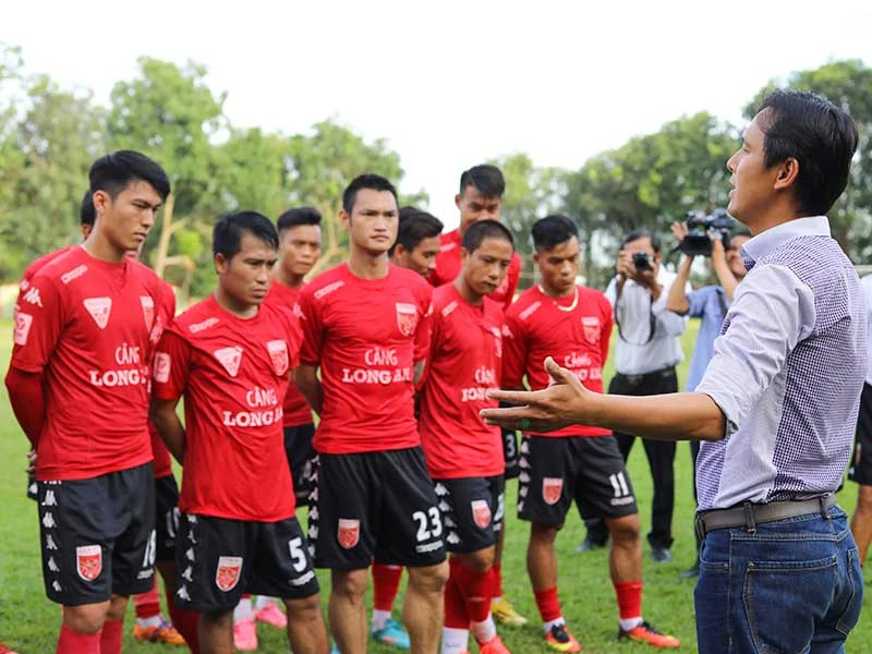 HLV Minh Phương đang vực lại tinh thần cầu thủ Long An. Ảnh: PHẠM HUY