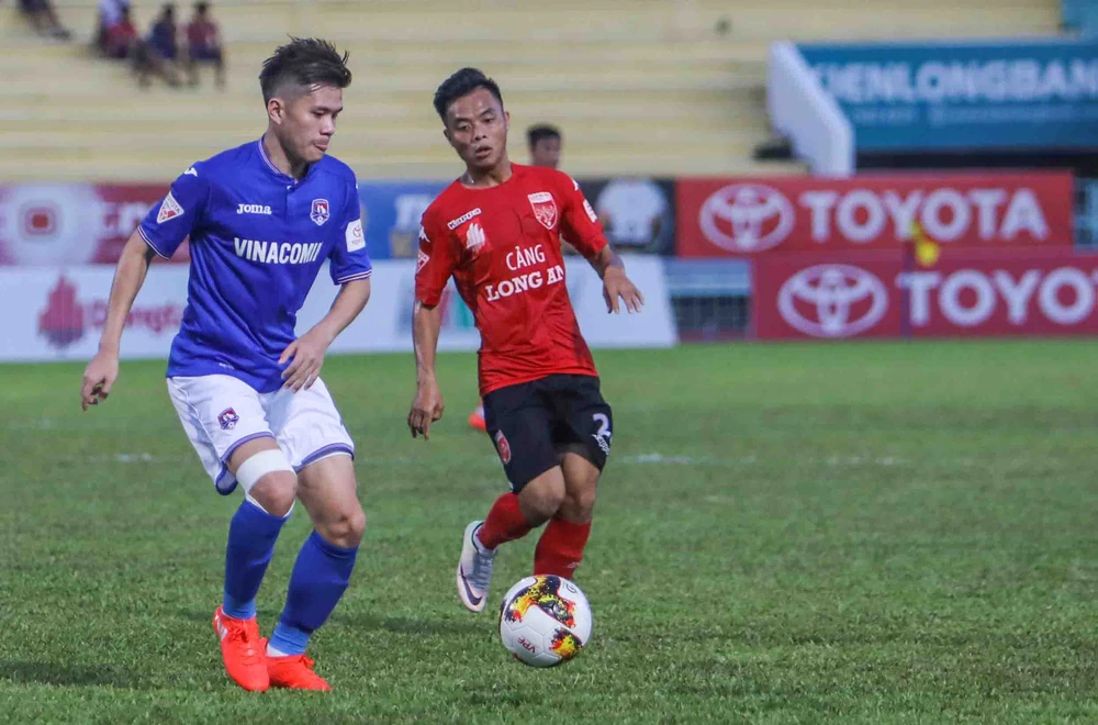 Long An (áo đỏ) thua trận thứ sáu thời HLV Minh Phương