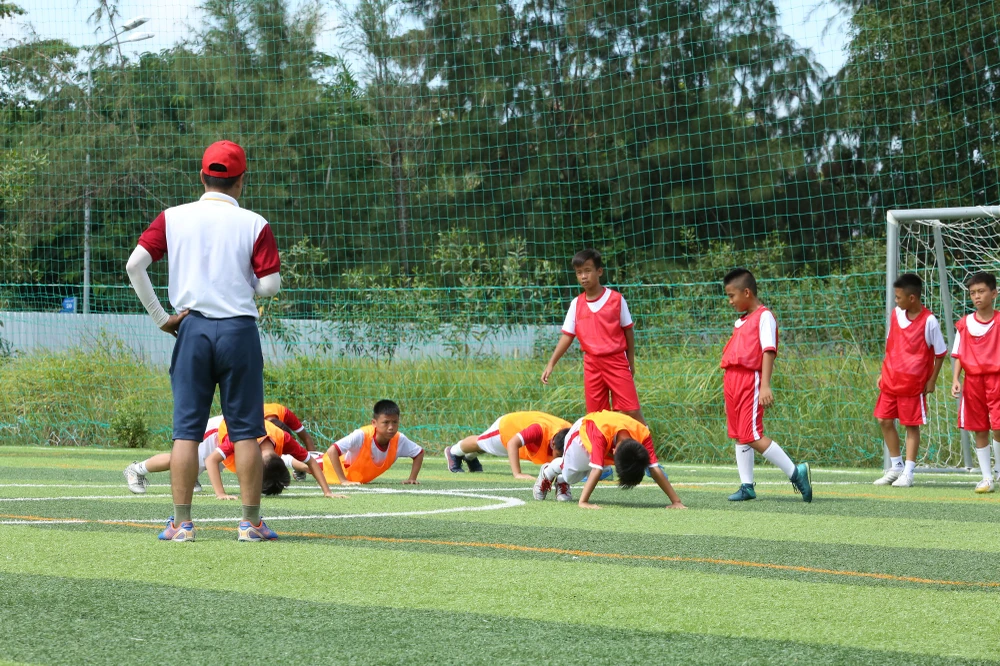 Các cầu thủ nhí bị phạt 10 lần chống đẩy. Ảnh: BEE