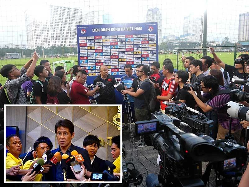 Cùng đứng trước áp lực của truyền thông và người hâm mộ nhưng có vẻ HLV Akira Nishino (ảnh nhỏ) căng thẳng hơn HLV Park Hang-seo rất nhiều. Ảnh: NGỌC DUNG - CTV
