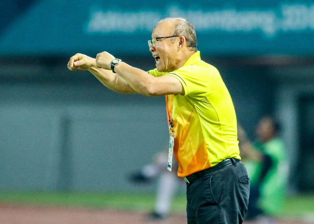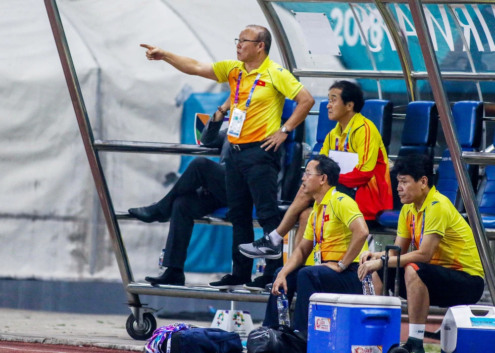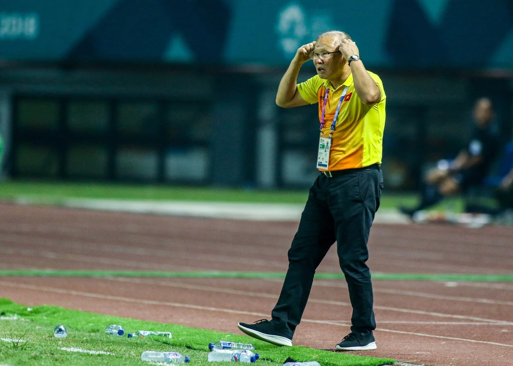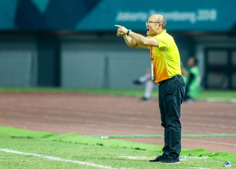 Ông Park vất vả chỉ đạo các cầu thủ Olympic Việt Nam trong suốt trận đấu.