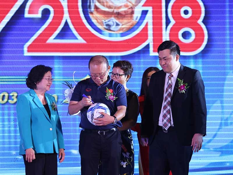 HLV Park Hang-seo ký tên vào quả bóng và chiếc áo thi đấu cho Quỹ học bổng Vừ A Dính và Câu lạc bộ “Vì Hoàng Sa - Trường Sa thân yêu”. Ảnh: HTD
