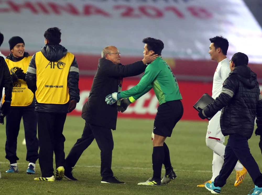 HLV Park Hang-seo chia vui với thủ môn Bùi Tiến Dũng sau chiến thắng nghẹt thở. Ảnh: CCT