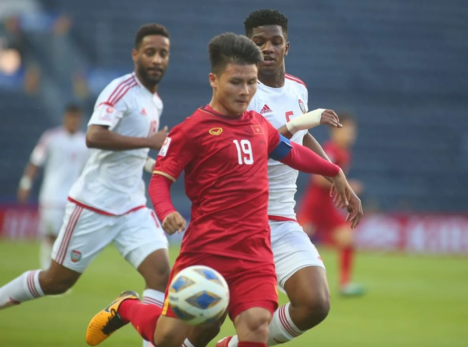 Quang Hải bị các cầu thủ UAE theo kèm rất chặt. Ảnh: TRÂM ANH