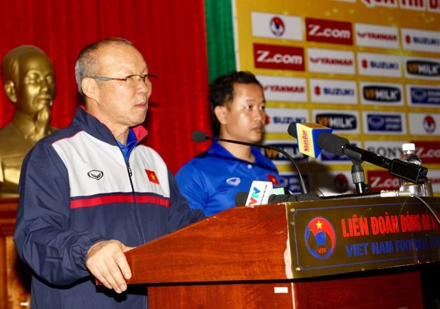 HLV Park Hang-seo trên bục phát biểu mở đầu buổi gặp gỡ. ẢNH: HUY PHẠM.