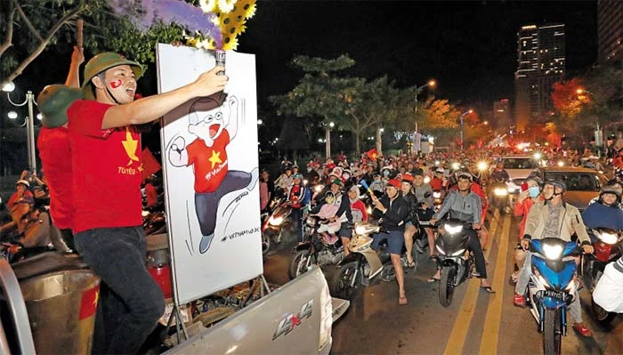 Rất đông người yêu bóng đá Việt Nam đã xuống đường ăn mừng sau chiến thắng...
