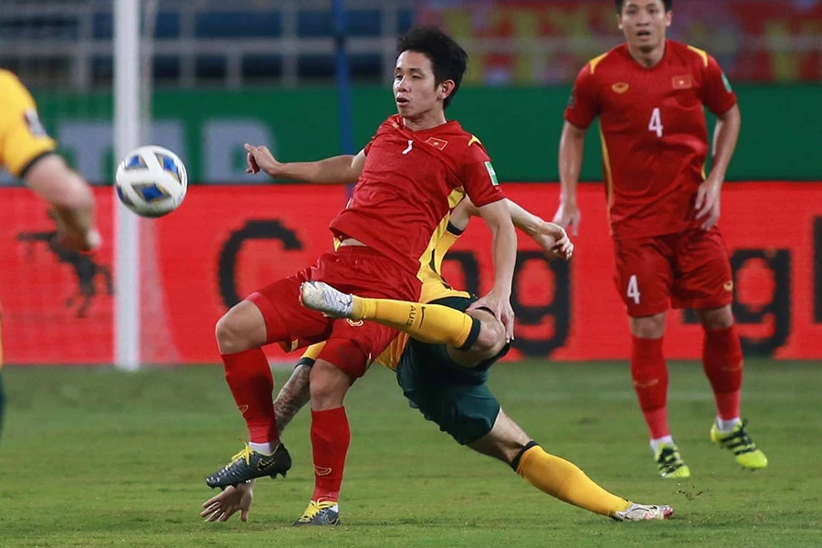 Hồng Duy ra sân từ đầu trận và đã có một trận đấu rất hay khiến nhiều cầu thủ Úc vất vả. Ảnh: ANH THỎA