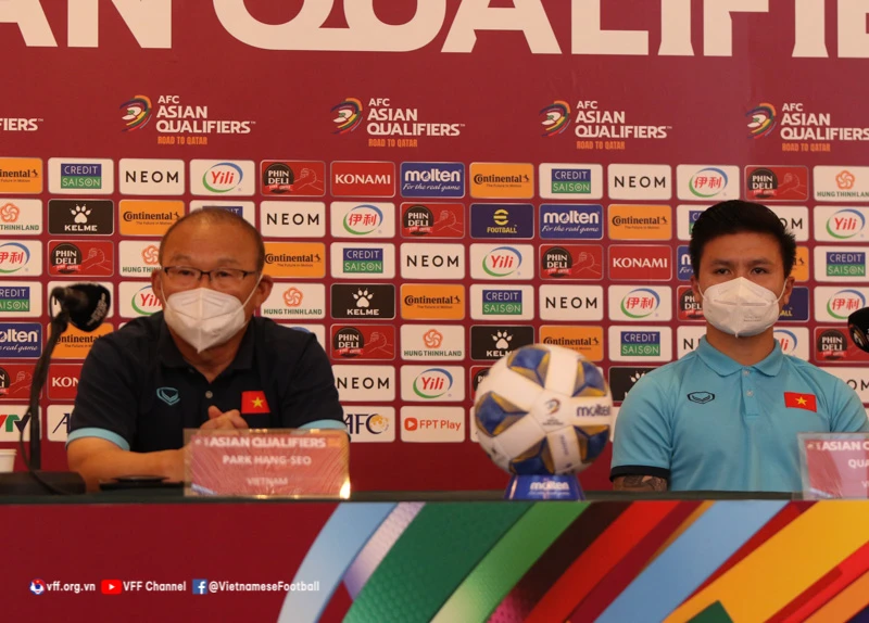 Thầy Park và Quang Hải trong buổi họp báo. ẢNH: VFF