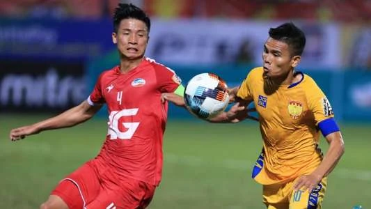 Hai đội trưởng Bùi Tiến Dũng (Viettel) và Văn Thắng (Thanh Hóa) chạm trán nhau. Ảnh: Internet