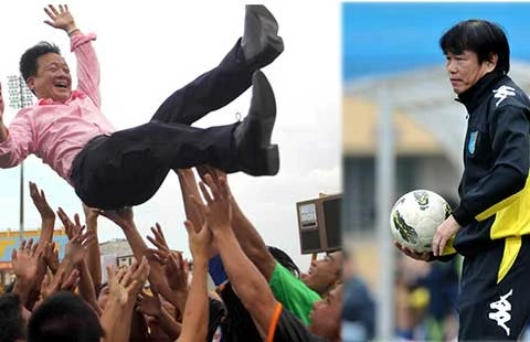 HLV Phan Thanh Hùng (ảnh phải) từng ở trong ruột Hà Nội T&T, từng “ôm chân” Sài Gòn XT cho SHB Đà Nẵng đăng quang , bầu Hiển được tung hô (ảnh trái). Ảnh: XUÂN HUY