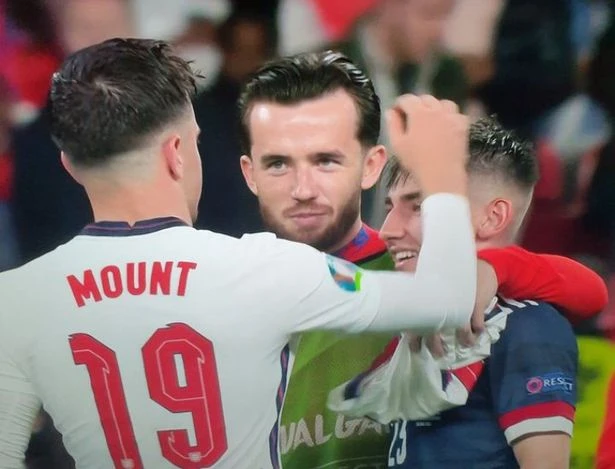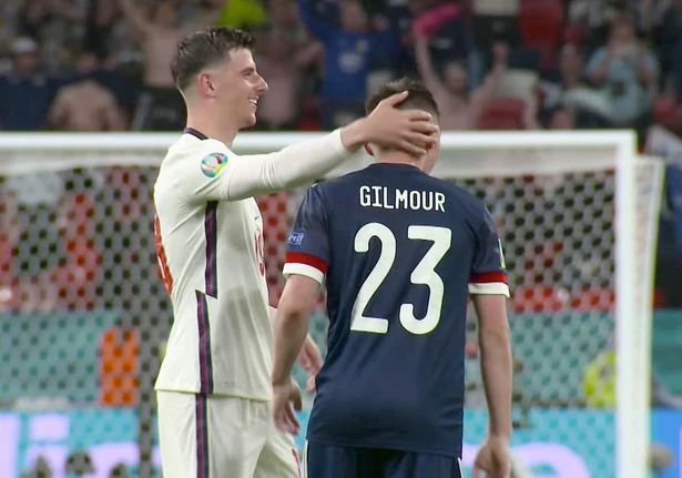 Gimour, Mason Mount và Ben Chilwell cùng thuộc biên chế CLB Chelsea. Và sau trận Anh hòa Scotland 0-0, ba cầu thủ này đã lại gần ôm nhau và trò chuyện.