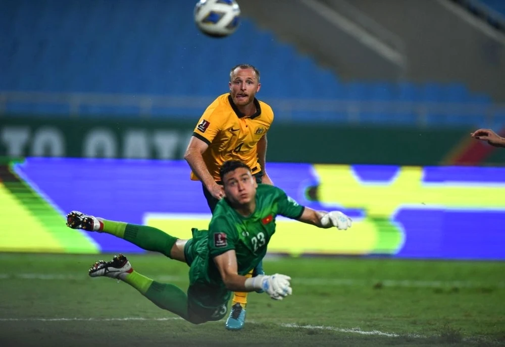 Thủ môn Văn Lâm bất lực trước cú đánh đầu ghi bàn của Rhyan Grant. ẢNH: GETTY