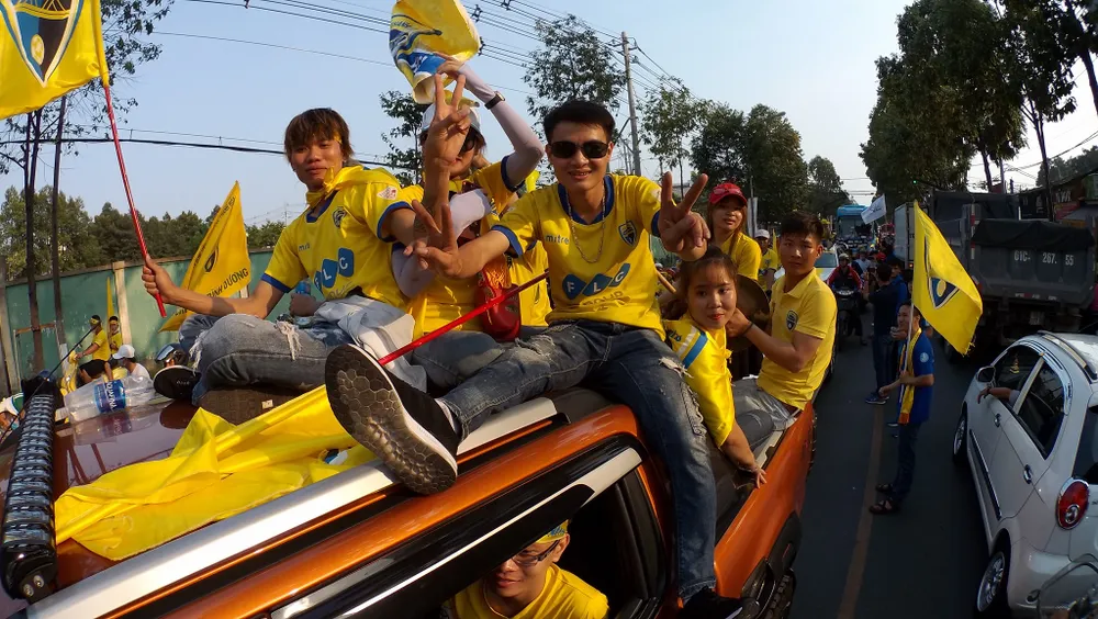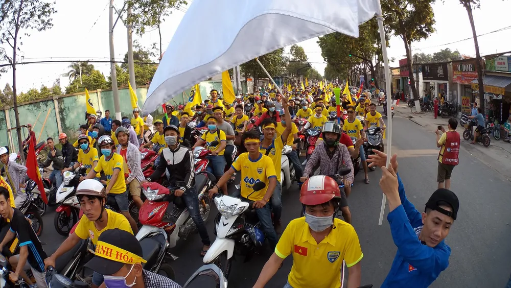 Trời nắng nóng như thiêu nhưng dọc quốc lộ 13 từ hướng TP.HCM lên vòng xoay TP Thủ Dầu Một sát sân Bình Dương, hàng ngàn CĐV Thanh Hóa nhuộm vàng con đường này với những chiếc áo vàng cùng kèn hơi cổ vũ.