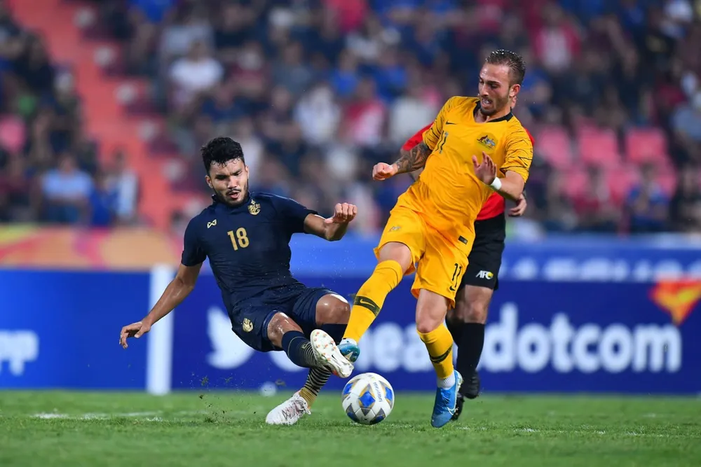 Chủ nhà Thái Lan trong trận thua ngược U-23 Úc (áo vàng) tỉ số 1-2. Ảnh: FAT