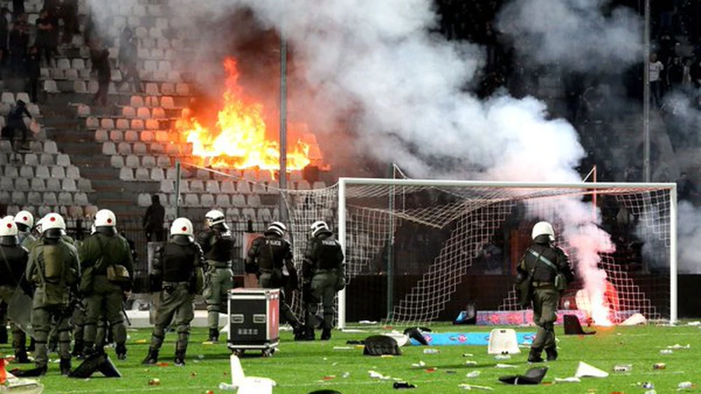 Trận derby của giải vô địch Hy Lạp Super League giữa PAOK Salonika và Olympiakos hôm qua đã phải hoãn vì cổ động viên hai đội choảng nhau, họ choảng cả HLV Oscar Garcia dập môi, bể gối phải nhập viện.