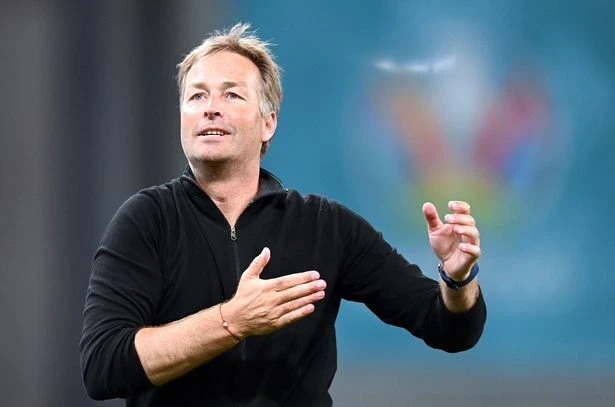 HLV Kasper Hjulmand của Đan Mạch đeo vòng tay may mắn màu đỏ. ẢNH: REX