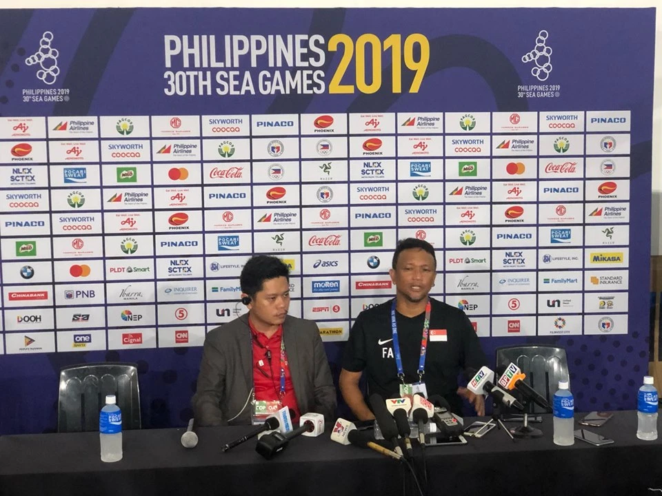 HLV Fandi Ahmad trong buổi họp báo sau trận đấu. ẢNH: CÔNG TUẤN
