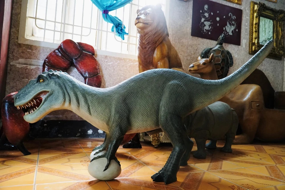 Tượng khủng long được anh tạo hình khá kỳ công và bắt mắt với thiết kế sinh động và chỉnh chu từ chi tiết mắt, mũi, miệng đến hàm răng.“Nó được làm toàn bộ từ bìa giấy carton nên khá nhẹ có thể nhấc bổng lên, đặc biệt có độ chịu lực khá tốt, từ 2 đến 3 người ngồi lên vẫn không sao”- anh Hải nói.