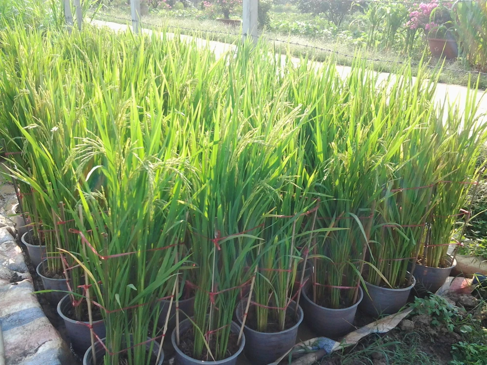 Những chậu lúa kiểng với chùm hạt lúa vàng ươm, chuẩn bị đem bán cho người dân mua về chưng tết
