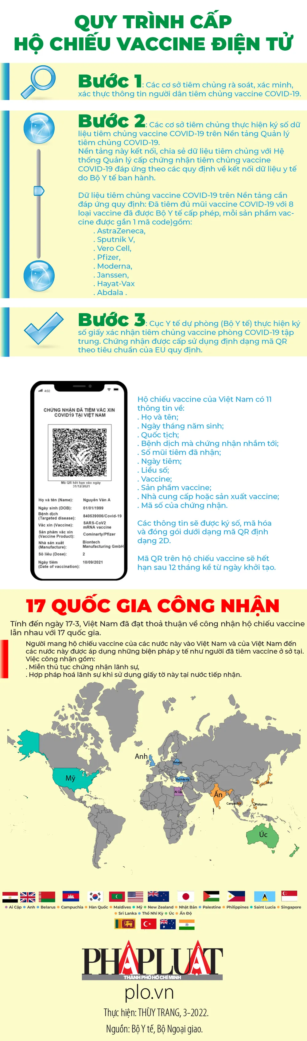 (PLO)- Đây là 3 bước Quy trình cấp hộ chiếu vaccine điện tử tại Việt Nam. Tính đến ngày 17-3, Việt Nam đã đạt thoả thuận về công nhận hộ chiếu vaccine lẫn nhau với 17 quốc gia.