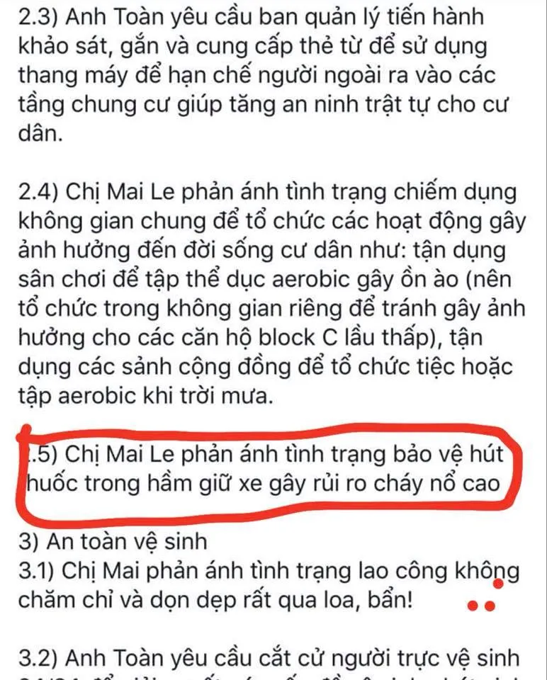 Chị Mai Lê phản đối việc cho thuê tầng thấp làm kho hàng vì an toàn cháy nổ. Chị cũng cho biết bảo vệ thường hút thuốc trong hầm giữ xe, nguy cơ cháy nổ rất cao.