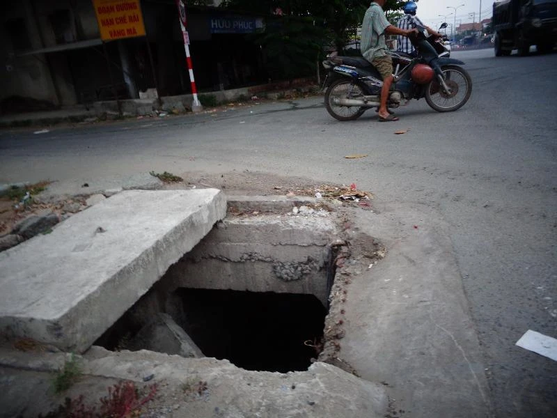 Ảnh chụp trên QL1K, phường Tân Đông Hiệp, TP Dĩ An., tỉnh Bình Dương. Một cái hố sâu nằm ngay đầu hẻm, bị mất nắp. Người dân nơi đây cho biết hố nằm sát đường mà bị mất nắp gây nguy hiểm cho người và phương tiện tham gia giao thông, nhất là người dân ra vào hẻm vào ban đêm, cũng như mùi hôi thối bốc lên mùa nắng nóng.