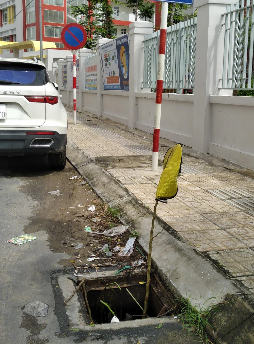 Người dân phải dùng cây gỗ, nhánh cây cắm vào hố ga để cảnh báo (ảnh chụp trưa 20 - 10).