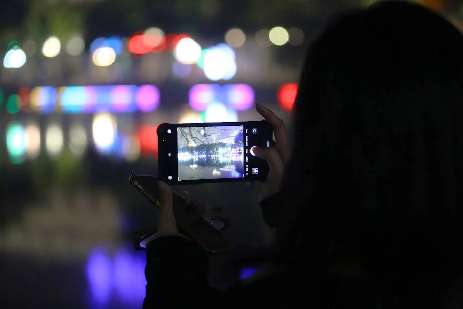 Một bạn trẻ chụp lại khoảnh khắc Hồ Gươm phát sáng lung linh, rực rỡ trong ánh đèn LED quanh hồ.