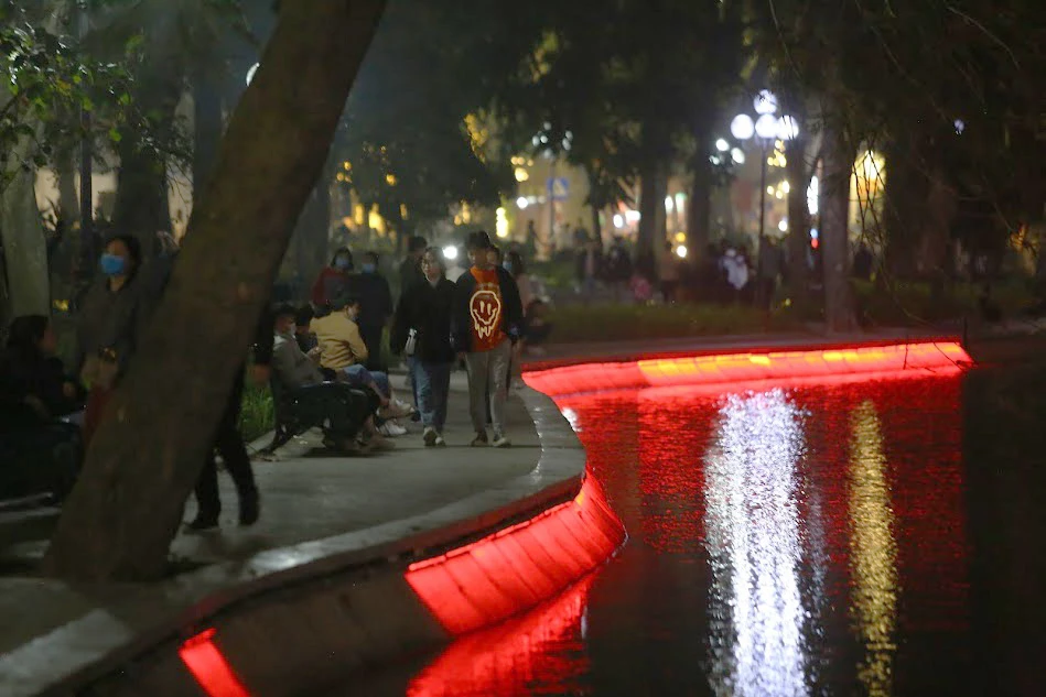 Những cụm đèn LED với màu sắc rực rỡ lắp quanh kè Hồ Gươm.