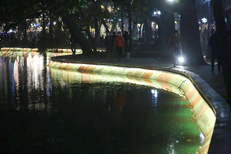 Những dải đèn LED rực sáng uốn lượn theo kè Hồ Gươm.