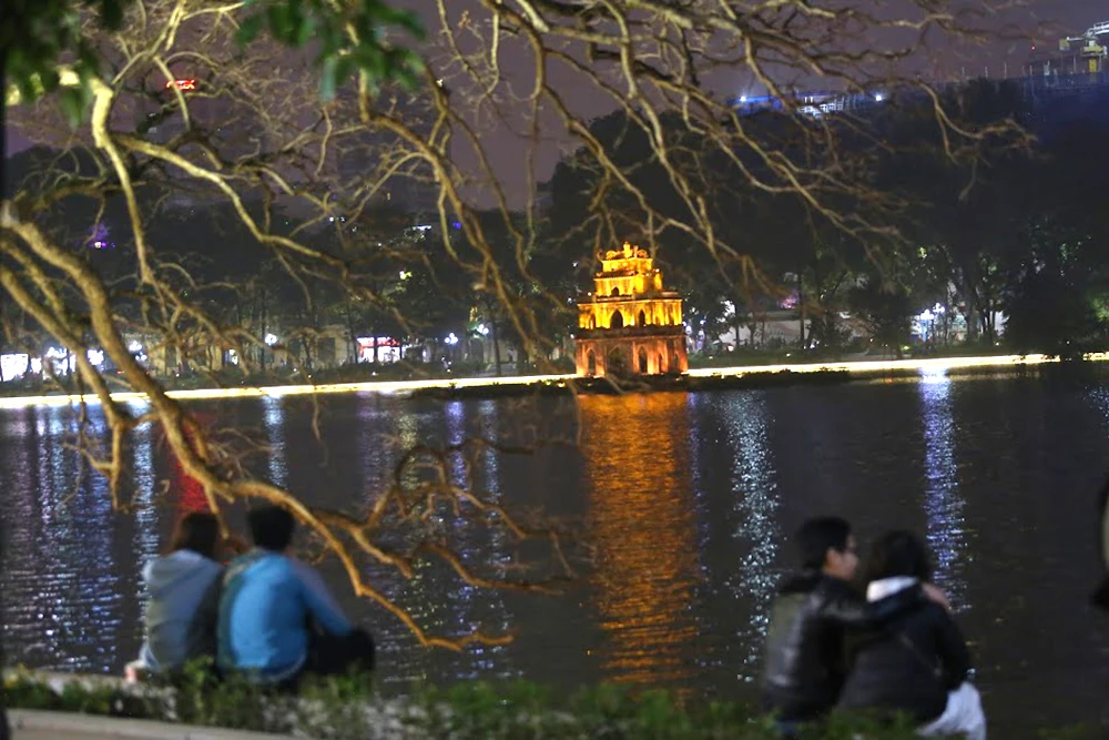 Nhiều bạn trẻ đắm mình trong không gian lung linh của Hồ Gươm.