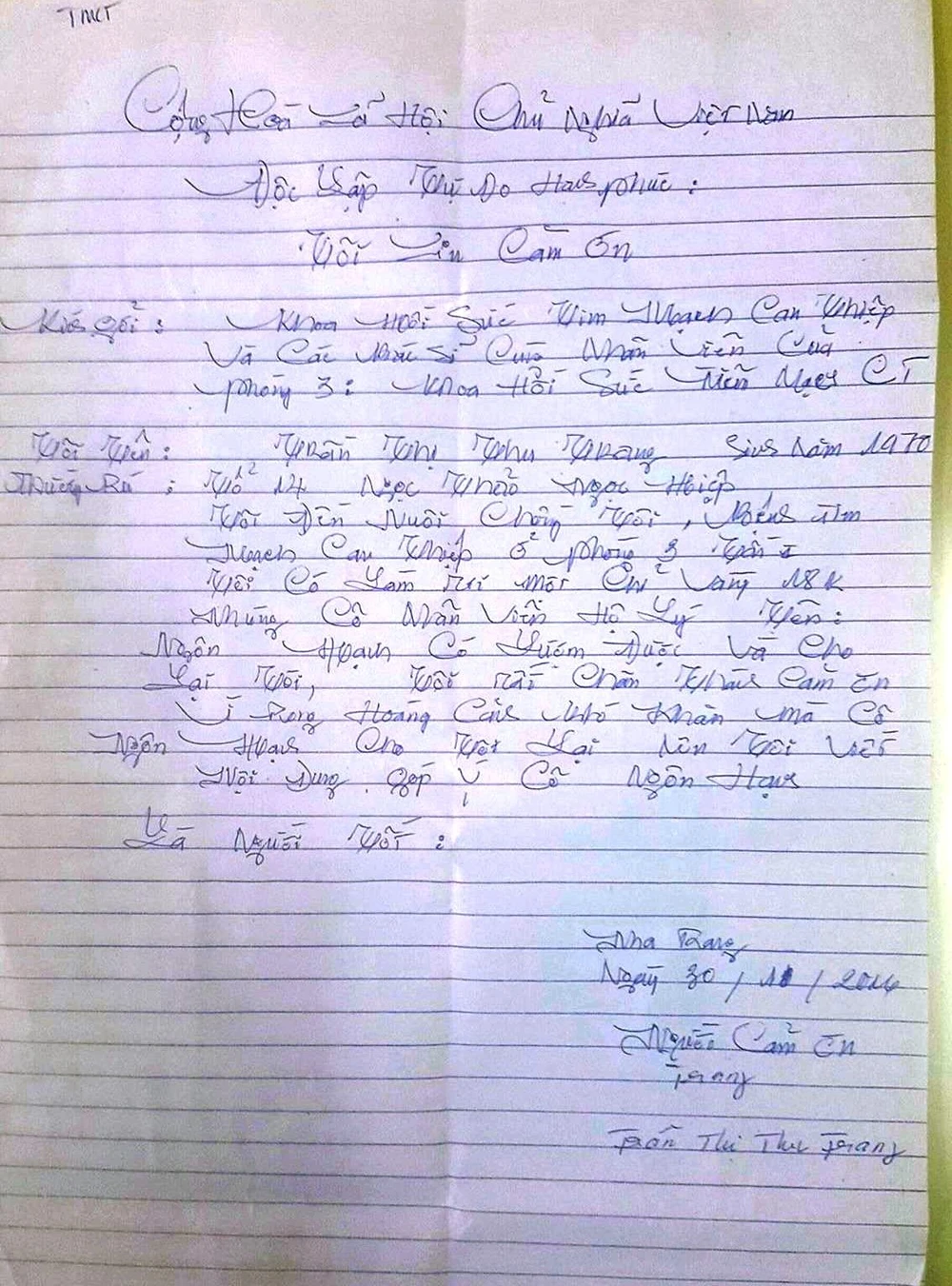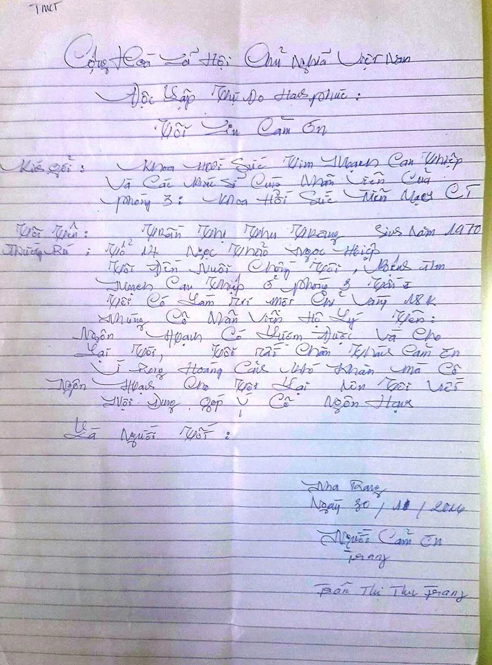Chỉ khi người nhà của bệnh nhân là bà Trần Thị Thu Trang (47 tuổi), ở tổ 14 Ngọc Thảo, phường Ngọc Hiệp, TP Nha trang viết lời cảm ơn bỏ vào hộp thư góp ý của bệnh viện, qua đó lãnh đạo bệnh viện mới biết được nghĩa cử này.
