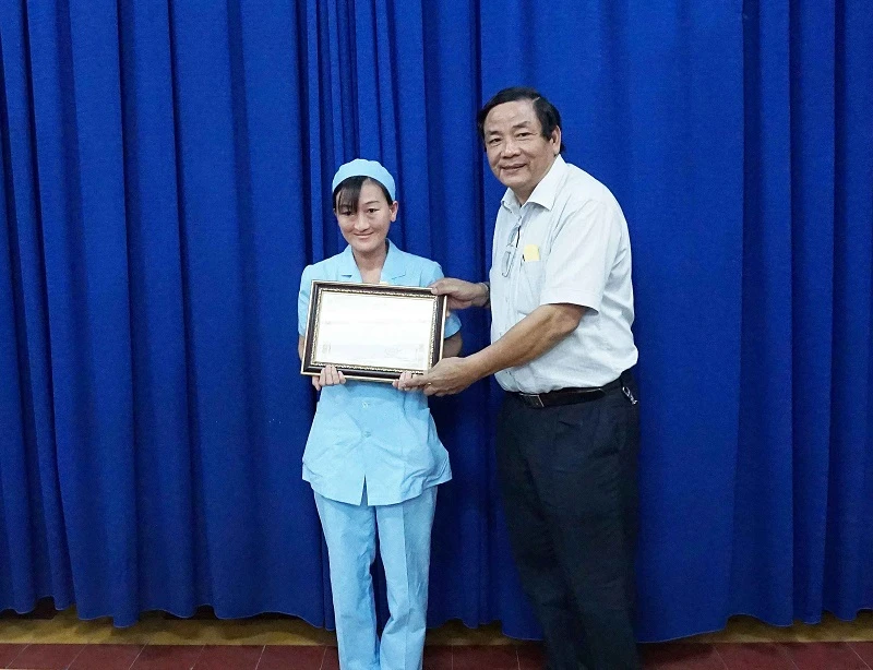 Giám đốc bệnh viện trao bằng tuyên dương cho hộ lý Hạnh.