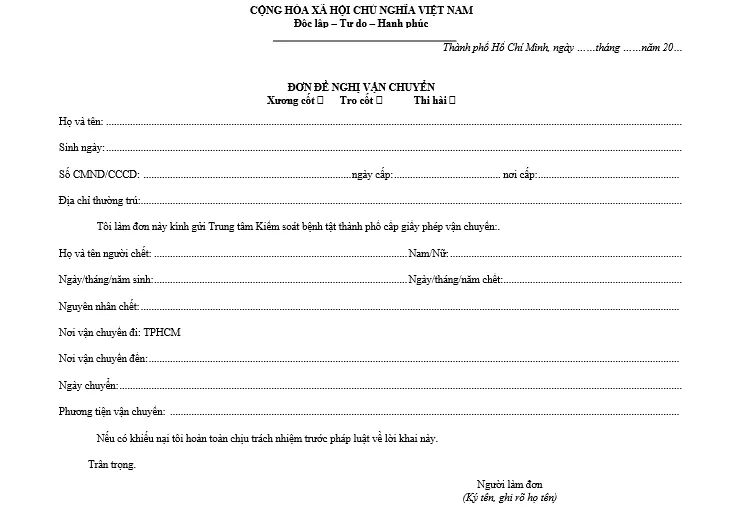 7. Đơn đề nghị vận chuyển (mẫu đính kèm).
