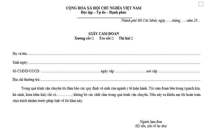 Sáng 2-12, Trung tâm Kiểm soát bệnh tật TP.HCM (HCDC) cho biết nơi đây vừa ban hành hướng dẫn thủ tục cấp giấy phép chuyển tro cốt, xương cốt, thi hài từ TP.HCM đi các tỉnh, TP trong nước bằng đường hàng không.