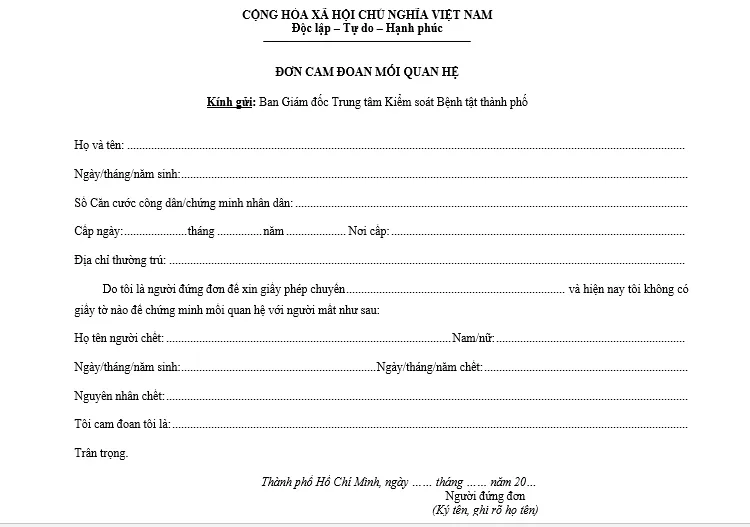 3. Giấy xác nhận mối quan hệ thân nhân (sổ hộ khẩu, giấy đăng ký kết hôn, giấy khai sinh). Nếu không có thì làm giấy cam đoan mối quan hệ (mẫu đính kèm).