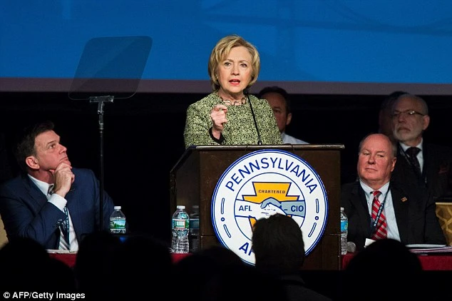 Ứng cử viên tổng thống của đảng Dân chủ Hillary Clinton phát biểu tại một cuộc họp với tổ chức lao động tại Philadelphia, Pennsylvania, Mỹ. (Ảnh: AFP)