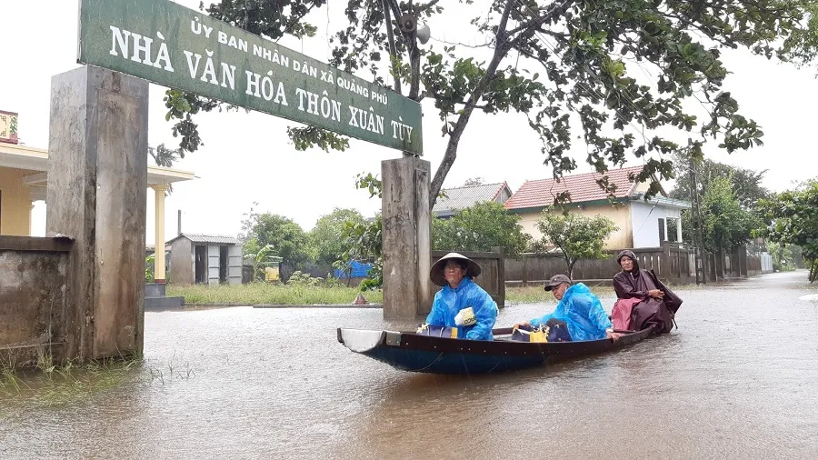 Người dân tại thôn Xuân Tùy, xã Quảng Phú, huyện Quảng Điền đi lại bằng thuyền trong sáng 17-10. Ảnh: N.D