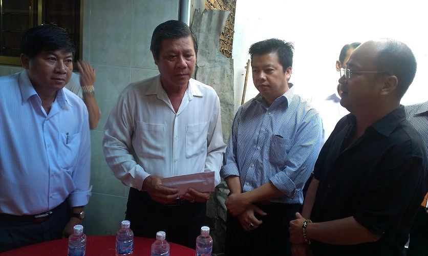 Ông Hoàng Sơn (bìa phải) đại diện cho công ty Phương Trang trao số tiền 50 triệu đồng cho gia đình tài xế Long