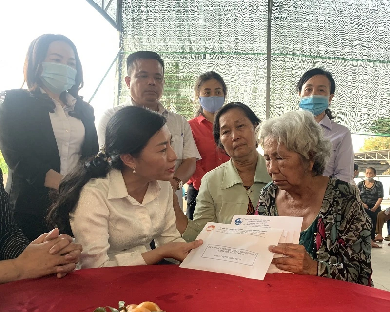 Phó Chủ tịch Ủy ban MTTQ Việt Nam TP.HCM Phan Kiều Thanh Hương trao số tiền hỗ trợ 80 triệu cho gia đình. Ảnh: MTTQ