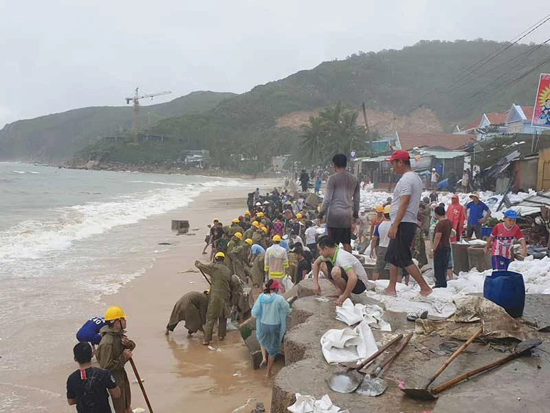UBND TP Quy Nhơn (Bình Định) ngày 1-11 tiếp tục huy động hàng trăm người thuộc nhiều lực lượng khắc phục kè biển chắn sóng tại xã Nhơn Hải bị triều cường, sóng lớn đánh sập sau bão số 5.