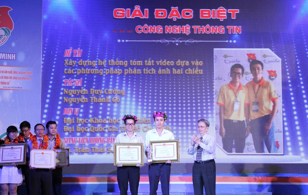 Đặc biệt, để tiếp tục giúp các bạn thí sinh tham gia triển khai ứng dụng, thương mại hóa đề tài nghiên cứu khoa học và tiếp tục phát triển đề tài, Trung tâm Phát triển Khoa học và Công nghệ Trẻ đã tiếp nhận ba đề tài để hỗ trợ gồm: Xây dựng hệ thống tóm tắt video dựa vào các phương pháp phân tích ảnh hai chiều của nhóm bạn Nguyễn Duy Cường, Nguyễn Thành Gô, Khoa Công nghệ Thông tin- trường Đại học Khoa học Tự nhiên- Đại học Quốc gia TP.HCM (đề tài đạt giải đặc biệt); Xây dựng thuật toán nhận diện đặc trưng sinh trắc học lòng bàn tay palmprint trên nền tảng di động của bạn Nguyễn Duy Thiên, Đại học Khoa học Tự nhiên (đề tài đạt giải khuyến khích); Đánh giá tác động của liệu pháp nghệ thuật trên người bị stress của bạn Phan Tường Yên, Khoa Tâm lý- Trường Đại học Khoa Học Xã Hội Nhân Văn- Đại học Quốc Gia TP Hồ Chí Minh (đề tài đạt giải nhì).