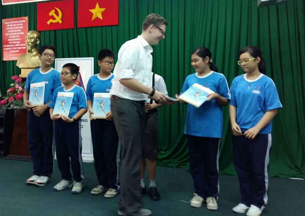Đại diện tổ chức ZFA trao tặng sách cho học sinh lớp tiếng Đức, Trường THCS Lê Quý Đôn. Ảnh: Hải Quý