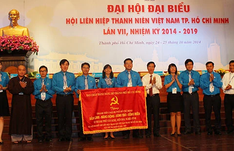 Thành ủy TP.HCM tặng cờ thi đua cho Hội Liên hiệp Thanh niên Việt Nam TP.HCM. Ảnh: H.LAN