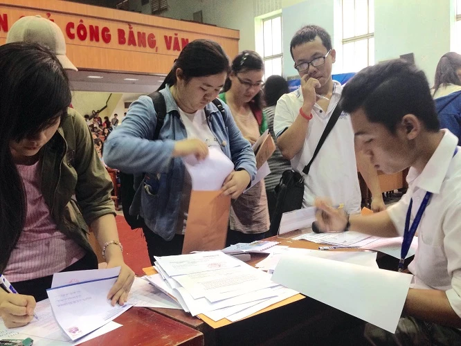 Thí sinh nộp hồ sơ xét tuyển vào trường Đại học Kinh tế TP.HCM.Ảnh: P.ĐIỀN